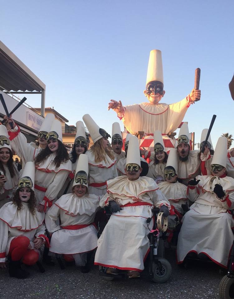 E’ stato uno dei carri più grandi del Carnevale: alto 22 metri – solo la testa è 8 metri – il Pulcinella sulla sedia a rotelle si è fatto strada, armato di manganello, all’interno di un percorso a ostacoli, con transenne, cartelli e limiti vari. Davanti alla costruzione hanno sfilato i volontari con distrofia muscolare. Si sono travestiti da Pulcinella proprio come i figuranti e i movimentisti del carro, ed hanno inscenato una coreografia sulle note di “Canto anch’io”, il brano realizzato da Lorenzo Baglioni feat. Iacopo Melio, “Volare” di Domenico Modugno, “Penso che un sogno così non ritorni mai più”, nella versione de Il Volo, e “Mi girano le ruote”, la tarantella ideata da Gianluca Domenici appositamente per il carro.