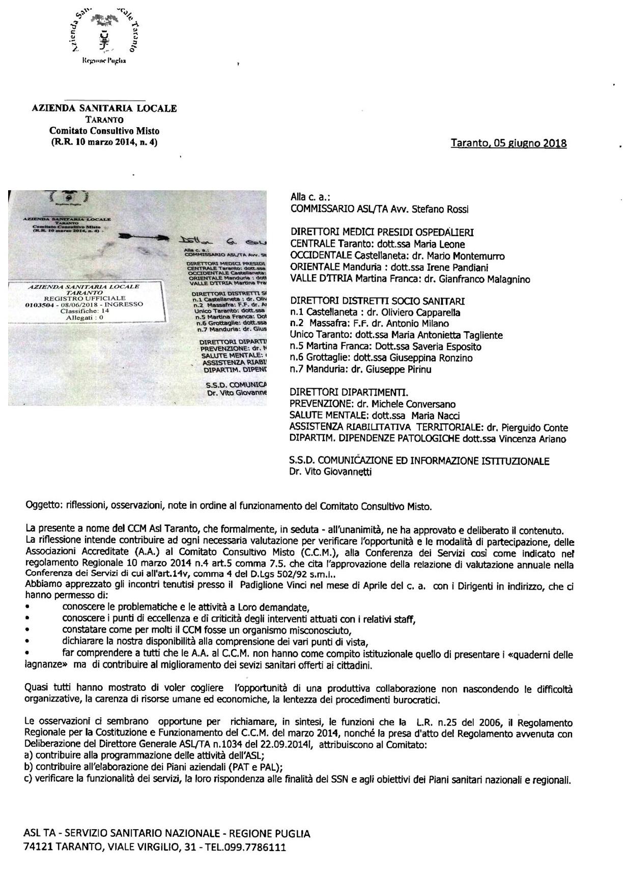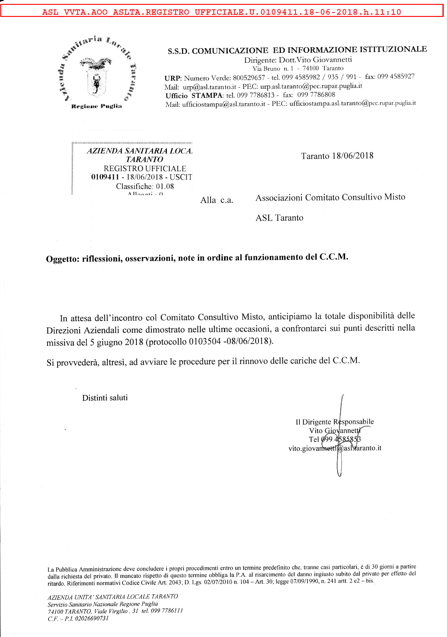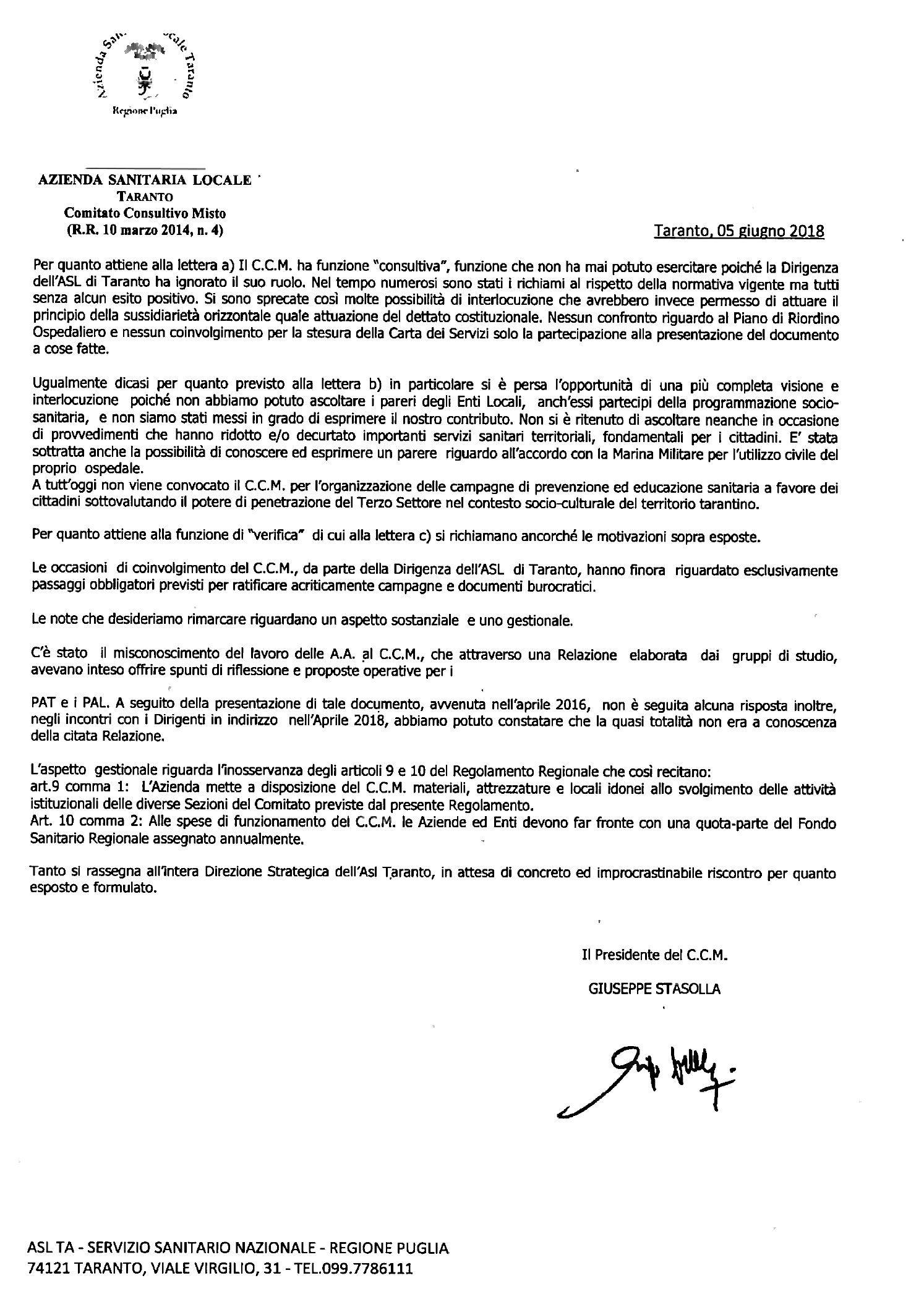 Come noterete questa nota, non contiene un riscontro concreto ed improcrastinabile, come richiesto espressamente nel documento inviato dal CCM in data 08.06.2018, dichiarando che sono stati sempre disponibili al confronto, ma, senza fare alcun cenno al fatto che l’ASL di Taranto non ha interpellato e consultato il CCM in alcune decisioni intraprese nell’ultimo periodo, come il riordino ospedaliero che ha chiuso il Pronto Soccorso dell’Ospedale Moscati e la redazione della Carta dei Servizi, nonchè sul fatto che il CCM non ha una sede operativa.