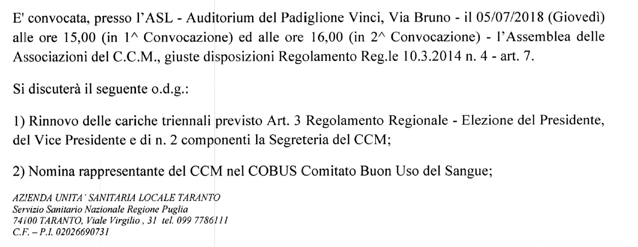 Alle ore 16:15 del 05/06/2018 nella sede del distretto ASL di Taranto (Via Ancona) è legalmente convocato in seconda convocazione il Comitato Consultivo Misto (CCM) dell’ASL TA/1.