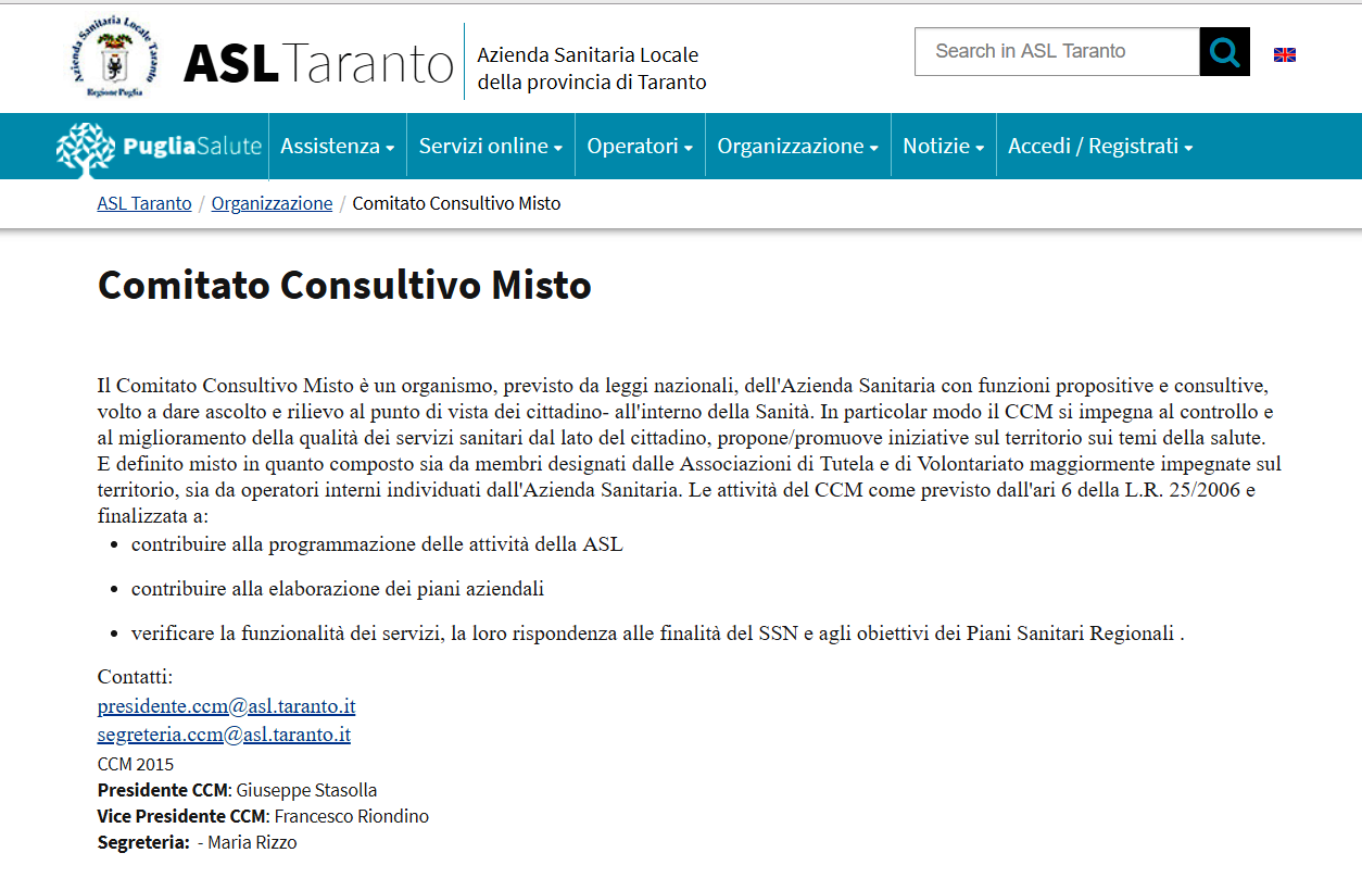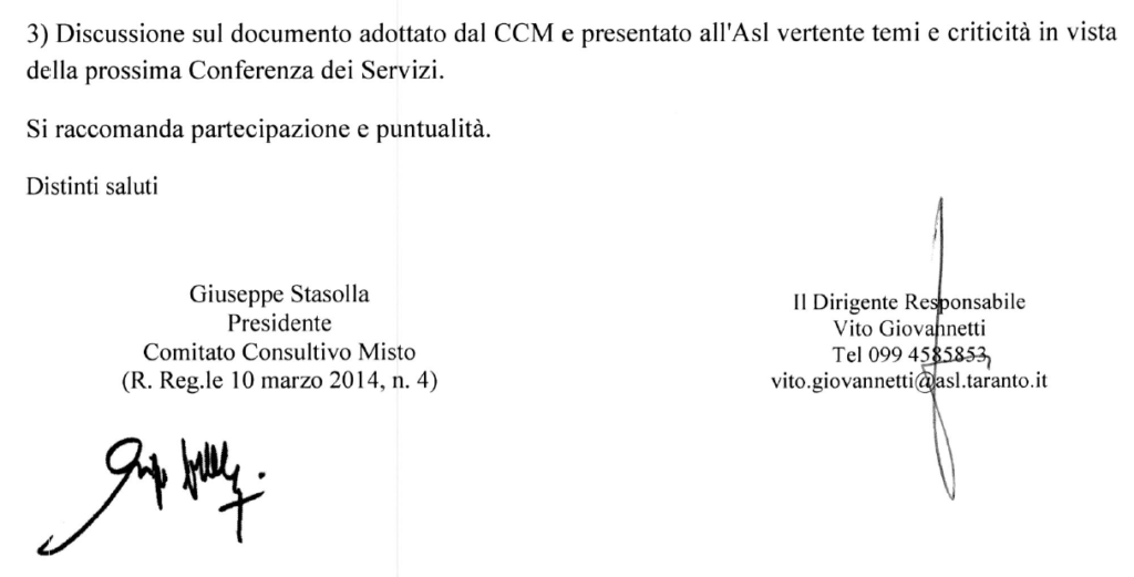Prima di esporvi il documento firmato dai rappresentanti delle n. 14 Associazioni presenti a questa convocazione, è doveroso segnalare che questo verbale non risulta essere riportato nel portale dell’ASL di Taranto, come potrete accertarvi al seguente link: https://www.sanita.puglia.it/web/asl-taranto/comitato-consultivo-misto