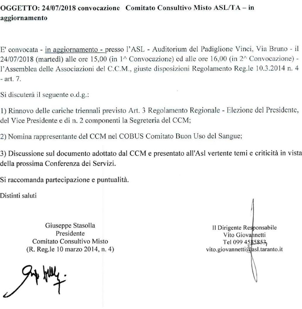 Invece, il 16 di questo mese arriva la convocazione per il 24 luglio, da cui si evince che non tiene conto di quanto dichiarato da Giuseppe Stasolla, vorremmo pensare che sia stata una svista o un modo di relegare il documento, che ricordo firmato da n. 14 Associazioni del CCM , come elemento in subordine alle elezioni delle nuove cariche sociali che, non avrebbero senso se non si focalizza il ruolo che deve avere il CCM, quello avuto negli ultimi sei anni, di non essere stato consultato in decisioni importanti dell’ASL di Taranto, la quale non ha, neanche tenuto conto di un lavoro effettuato due anni fa dalle Associazioni del CCM , contenuto in un documento, nel quale erano contenute proposte per diminuire lo scollamento esistente tra gli utenti e la Dirigenza dell’ASL.
