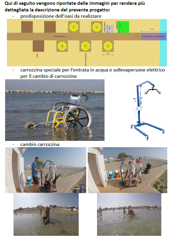 Si propone creare delle oasi con n. 5 postazioni in un tratto di spiaggia pubblica, in cui le persone con disabilità motorie, abbiano la possibilità di potervi accedere allo stesso modo degli altri cittadini. Persone, che proprio per queste condizioni, sono penalizzate nel non poter condurre una vita “normale” nel proprio ambito cittadino, nonché a non poter godere dell’utilizzo di una spiaggia pubblica o di uno stabilimento balneare privato, dovuto alla presenza di vari ostacoli, rappresentati dalla mancanza di corridoi d’accesso al mare ed ai servizi complementari (docce, wc, ecc.). Considerando, inoltre, gli enormi benefici psicofisici che ne potrebbero trarre, al fine di migliorare le proprie condizioni di vita.