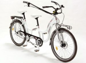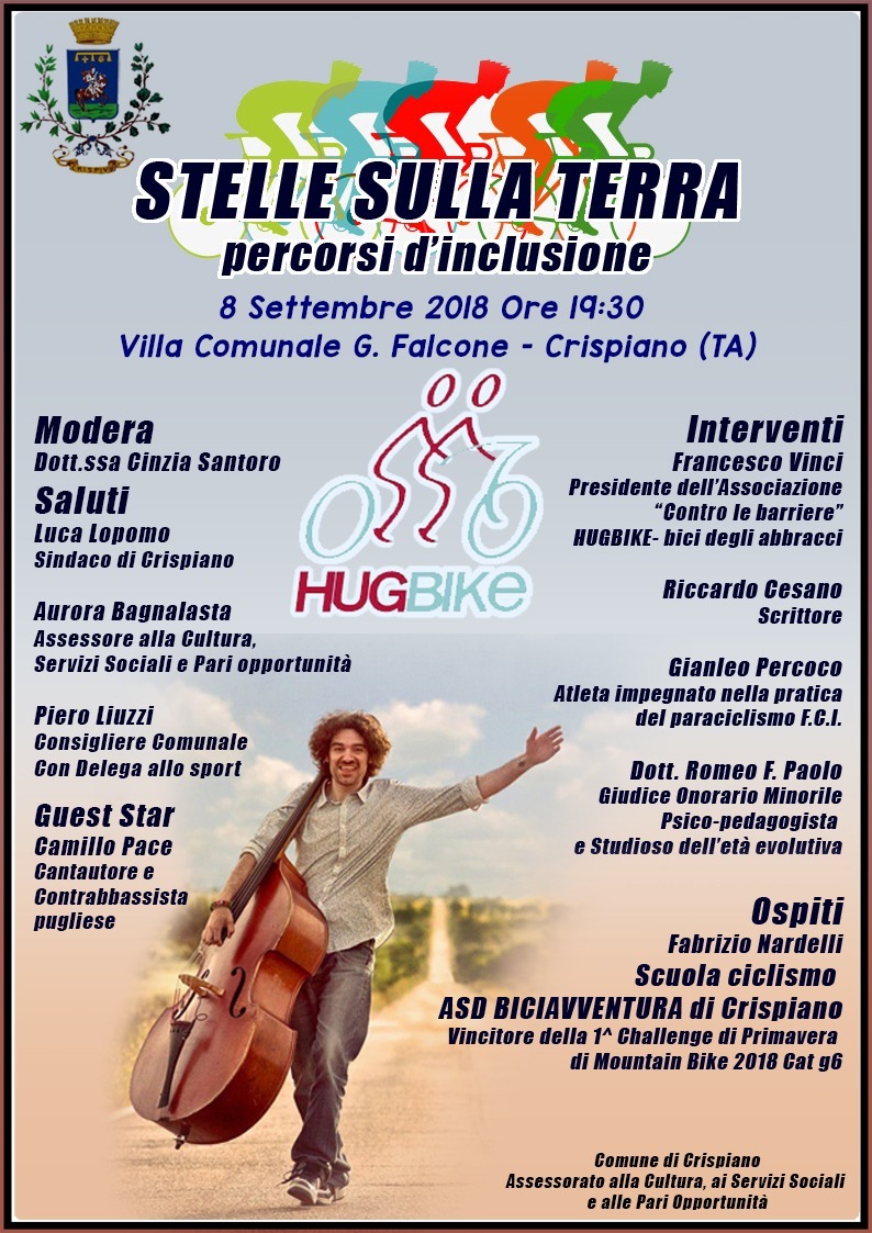 - metteremo a disposizione la HUGBIKE (la bicicletta degli abbracci), un tandem speciale che abbiamo ricevuto in donazione dalla Fondazione Allianz Umana Mente, la quale ne aveva messe a disposizione una per ogni regione italiana. L’HUGBIKE è un tandem diverso da quelli tradizionali: si guida dal sellino posteriore, grazie ad un lungo manubrio che fa sì che il passeggero che siede davanti sia “abbracciato” da chi conduce il tandem. La sua produzione è realizzata da un gruppo di ragazzi con disturbi dello spettro autistico, seguiti dalla Fondazione Oltre il Labirinto, che hanno fabbricato i primi prototipi della “bicicletta degli abbracci”; questa definizione, dunque, si sposa bene, oltre che con la particolare posizione del guidatore che “abbraccia” il passeggero, con la visione etica che caratterizza il progetto di produzione di questi speciali tandem. L’idea è nata da un padre con figlio disabile che ha progettato un sistema che gli ha consentito di portare con sé sulla bici il figlio, facendogli provare l’ebbrezza della corsa, ma al tempo stesso facendolo sentire al sicuro.