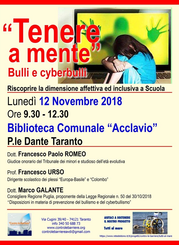 A tal proposito, l’Associazione “Contro le Barriere” ha ritenuto utile organizzare per il 12 novembre 2018, presso la Biblioteca Acclavio di Taranto (Piazzale Bestat), dalle ore 09:30 alle 12:30, un laboratorio formativo condotto dal Dott. Francesco Paolo Romeo, Giudice onorario del Tribunale dei minori e studioso dell’età evolutiva, al quale interverranno il Prof. Francesco Urso, Dirigente scolastico dei plessi “Europa-Basile” e “Colombo” ed il Dott. Marco Galante, Consigliere regionale proponente della legge in oggetto dell’evento.