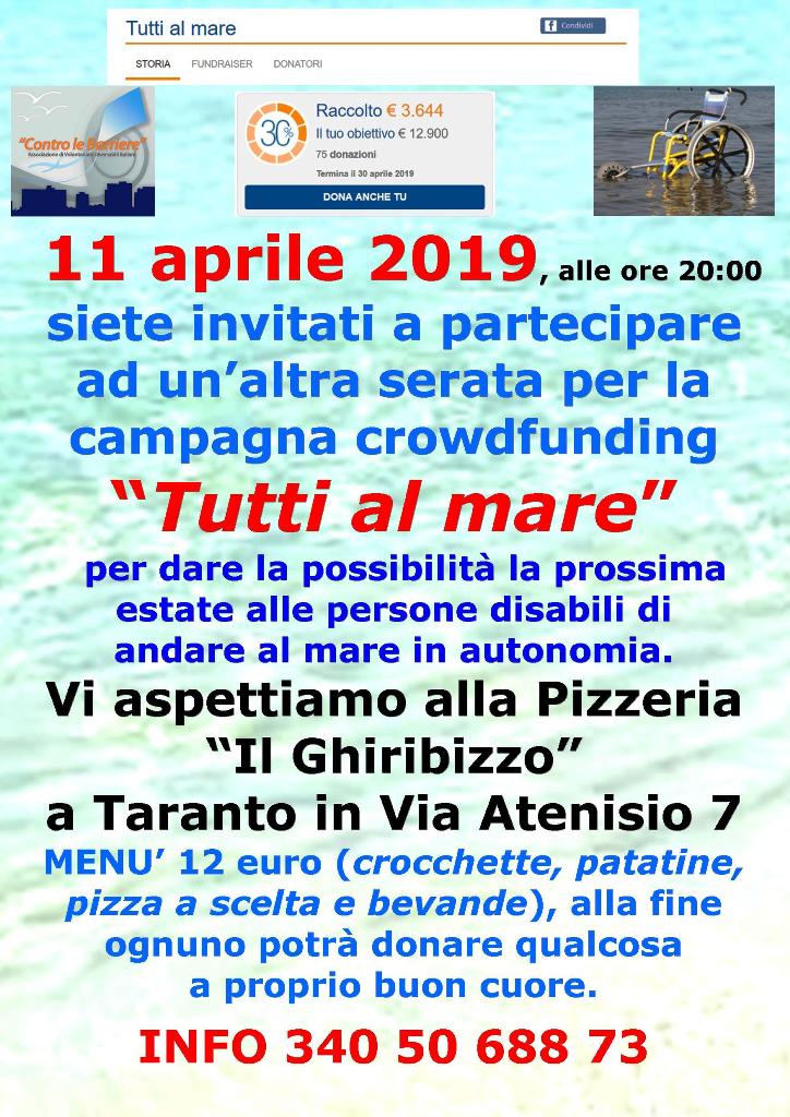 Dopo aver festeggiato l’inizio della Primavera, 21 marzo 2019, presso la Pizzeria “Santa Rita”, riuscendo a raccogliere 315,00 euro per la campagna crowdfunding “Tutti al mare” https://www.retedeldono.it/it/progetti/contro-le-barriere/tutti-al-mare, per dare la possibilità nella prossima stagione estiva alle persone disabili in carrozzina di poter accedere al mare in autonomia, organizza un’altra serata presso la Pizzeria “Il Ghiribizzo” (Taranto – Via Atenisio, 7), alla quale siete invitati a partecipare.