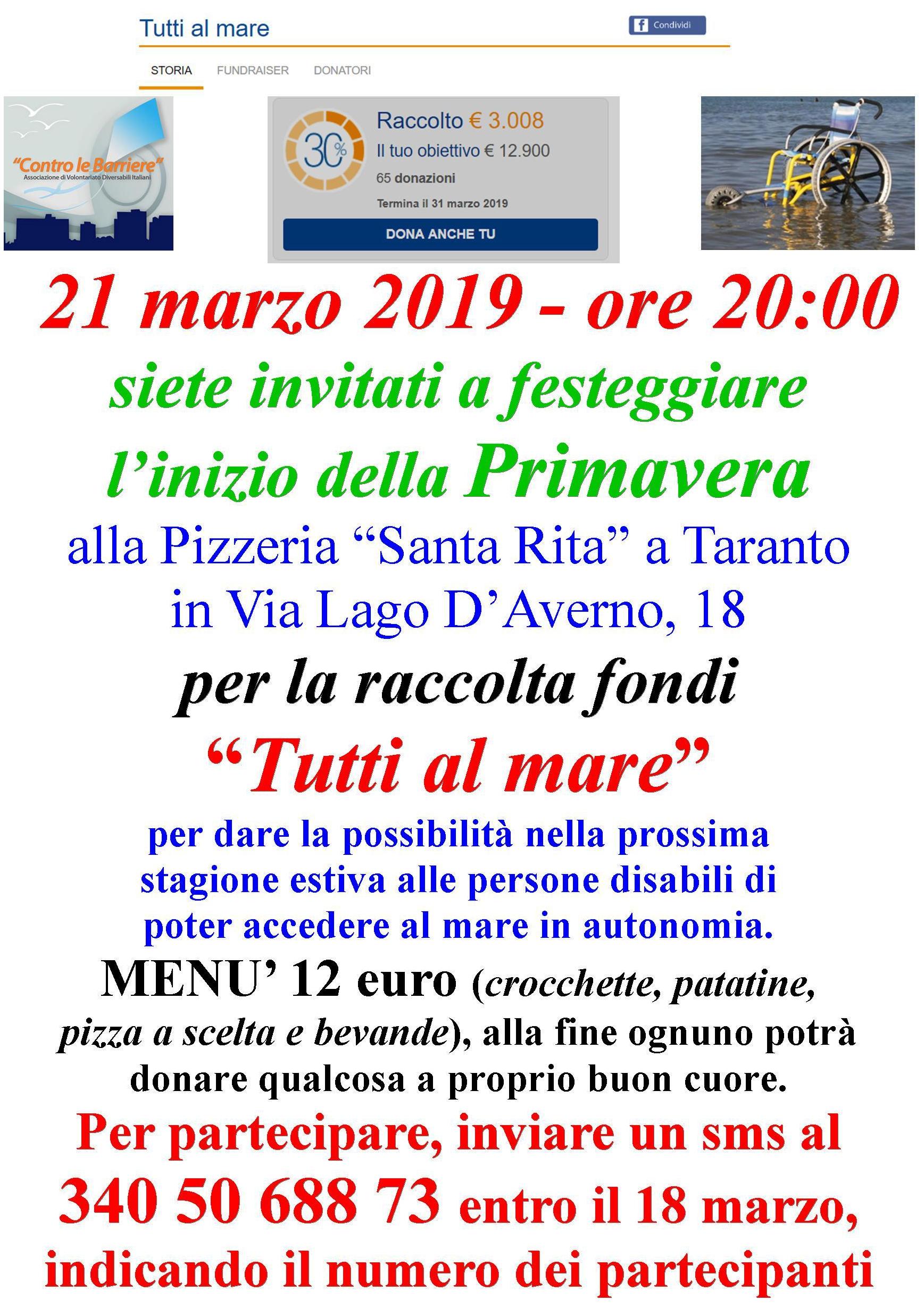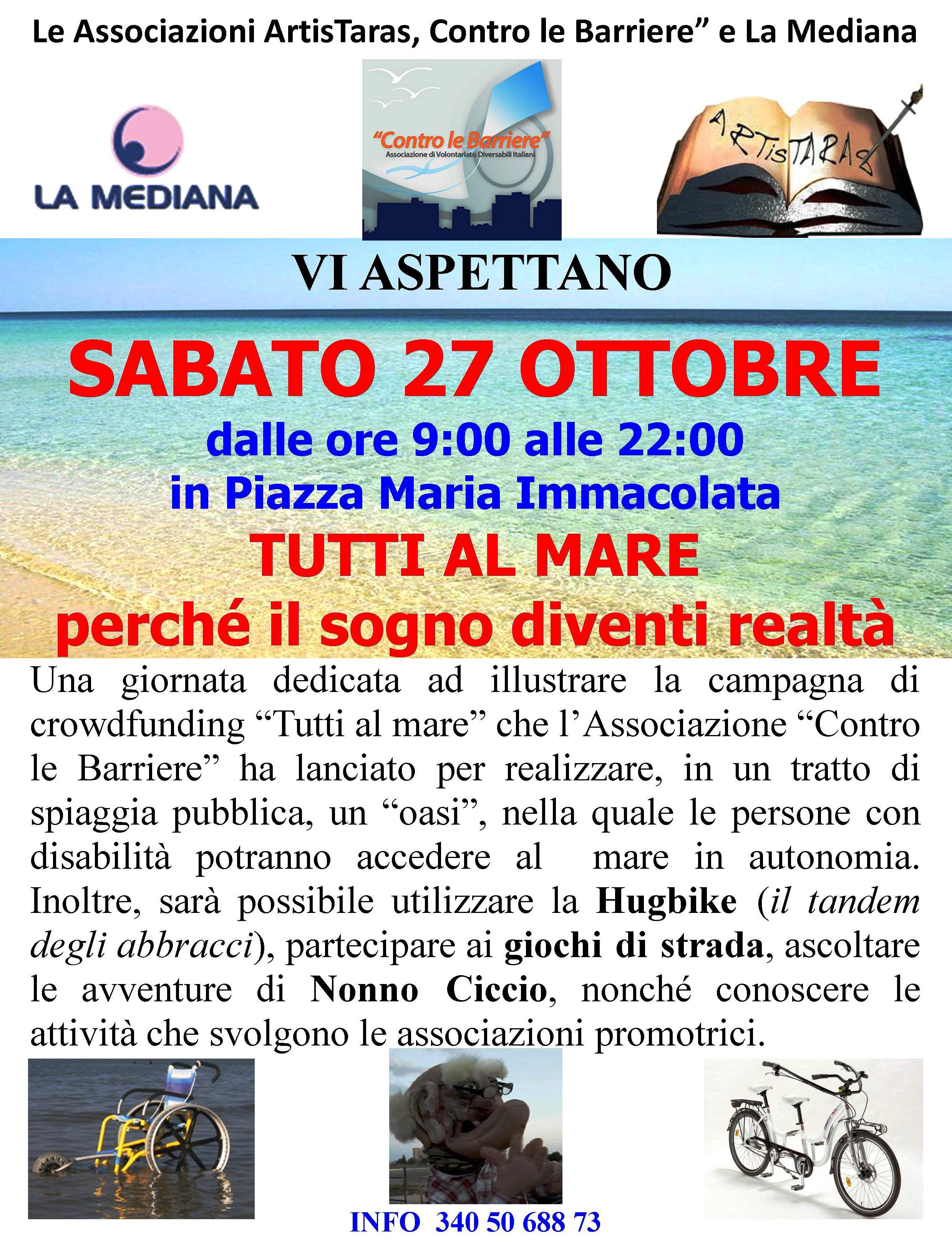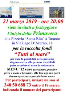 Il 1° settembre 2018, decidiamo di dare inizio ad una campagna crowdfunding “Tutti al mare“, al fine di utilizzare le due “Sand & Sea” per poter realizzare, in un tratto della litoranea tarantina, un’oasi in cui le persone con disabilità motorie abbiano la possibilità di poter accedere al mare nello stesso modo degli altri cittadini.