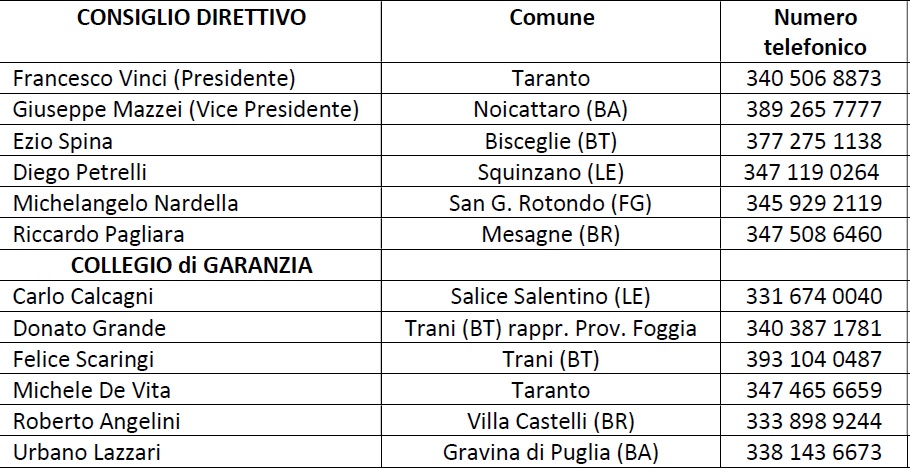 Alla presenza di n. 29 soci su n. 41 iscritti all’Associazione di Volontariato “Disabili Attivi”, l’Assemblea dei Soci, il 14 gennaio 2020, provvede a nominare il Presidente ed il Vice Presidente, che rispettivamente sono il Sig. Vinci Francesco di Taranto ed il Sig. Mazzei Giuseppe di Noicattaro (BA), successivamente, vengono nominati a comporre gli Organi Direttivi (Consiglio Direttivo e Collegio di Garanzia), i seguenti soci: per il Consiglio Direttivo, Nardella Michelangelo di San Giovanni Rotondo (FG), Pagliara Riccardo di Mesagne (BR), Petrelli Diego di Squinzano (LE) e Spina Ezio di Bisceglie (BT); mentre per il Collegio di Garanzia, Angelini Roberto di Villa Castelli (BR), Calcagni Carlo di Salice Salentino (LE), De Vita Michele di Taranto, Grande Donato di Trani (BT), Lazzari Umberto di Gravina di Puglia (BA) e Scaringi Felice di Trani (BT). Come noterete i componenti di questi Organi direttivi sono stati nominati due per le n. 6 province della Regione Puglia, al fine di poter essere meglio radicati in tutto il territorio regionale.