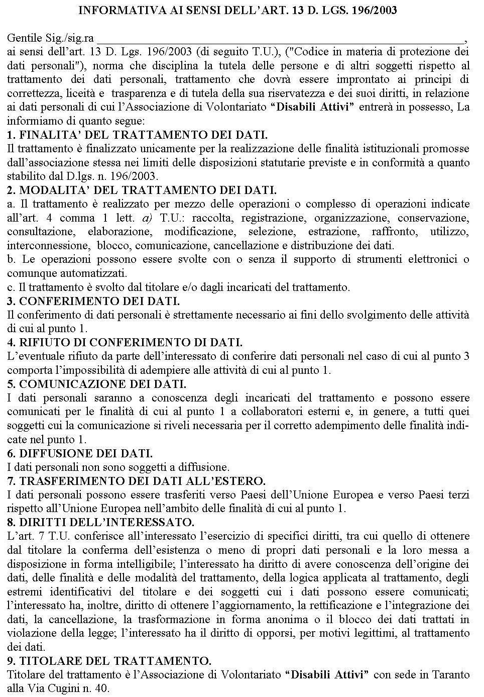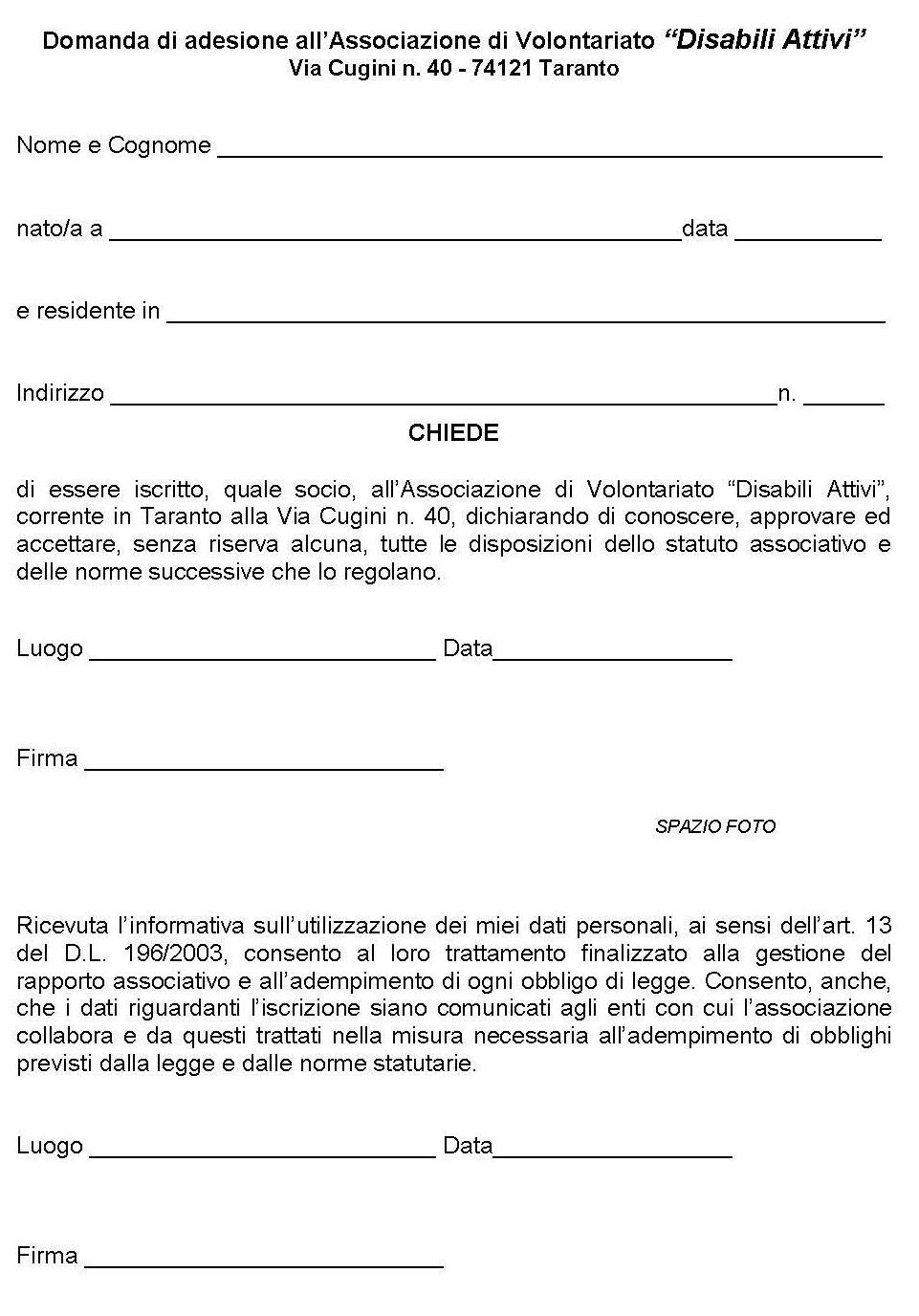 Per aderire a questa associazione necessita compilare la seguente scheda di adesione ed inviarla al seguente indirizzo disabiliattivi@libero.it o contattando telefonicamente i componenti degli Organi direttivi dell’Associazione.