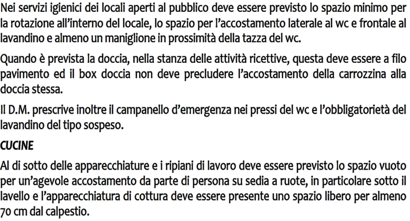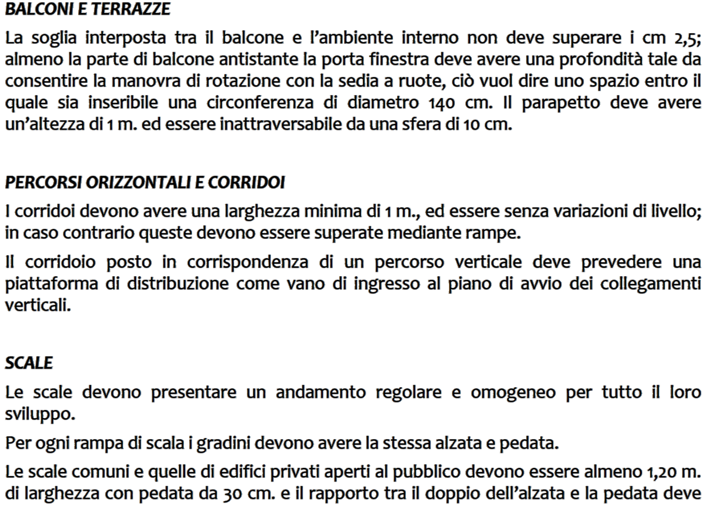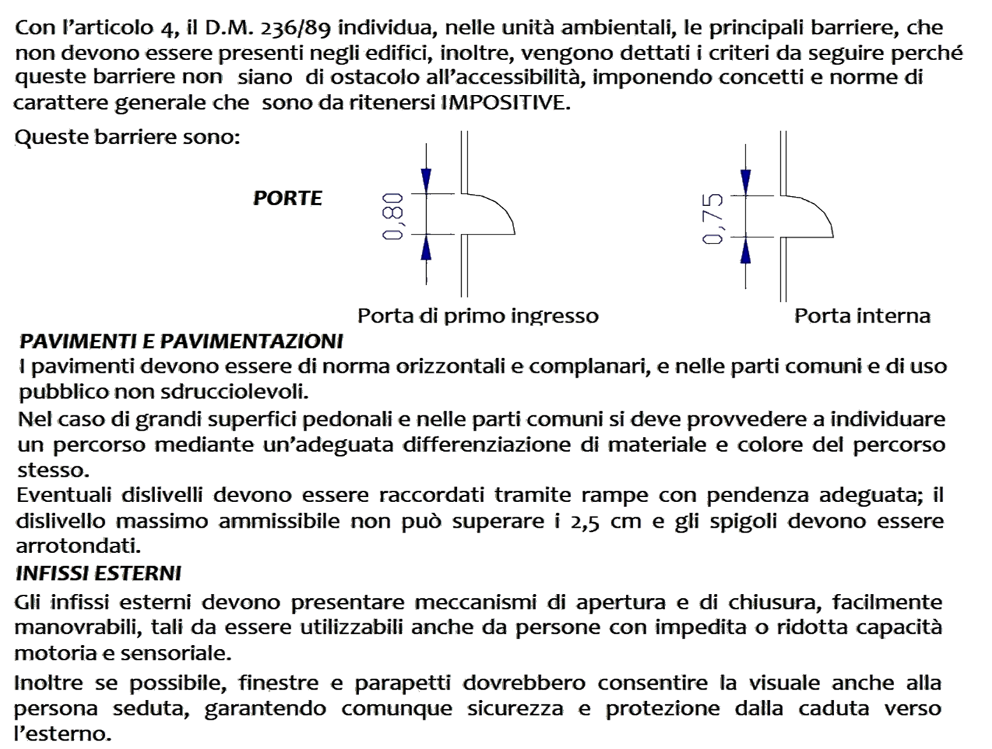 Inoltre, il D.M. 236/1989 stabilisce anche, per gli edifici e gli spazi privati, i parametri tecnici e dimensionali correlati al raggiungimento dei tre livelli di qualità citati: per esempio le dimensioni minime delle porte (largh. 85/90 cm.), le caratteristiche delle scale, la pendenza delle rampe pedonali (al max 8 %, largh. 90 cm.), gli spazi necessari alla rotazione di una sedia a ruote, le dimensioni degli ascensori e le casistiche della loro necessità, le caratteristiche di un servizio igienico accessibile e altri ancora.