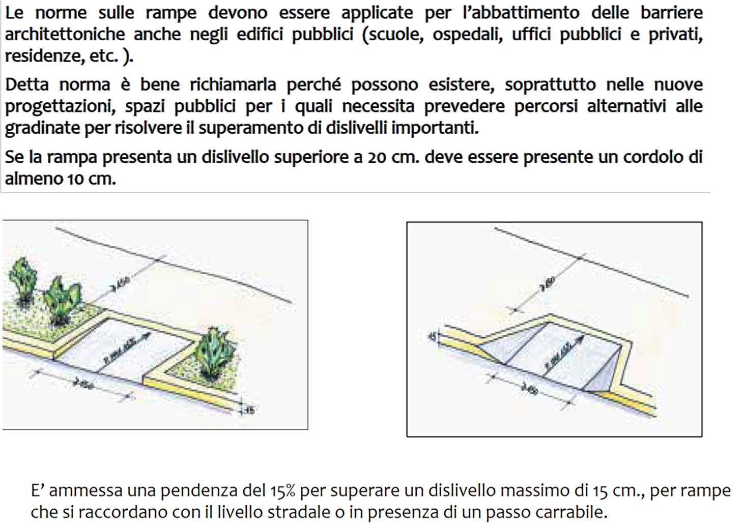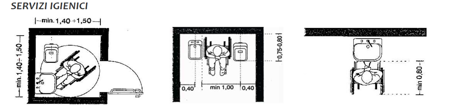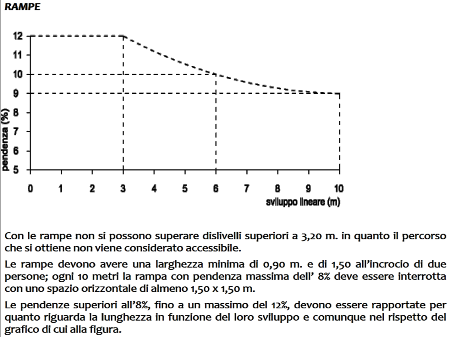 Inoltre, il D.M. 236/1989 stabilisce anche, per gli edifici e gli spazi privati, i parametri tecnici e dimensionali correlati al raggiungimento dei tre livelli di qualità citati: per esempio le dimensioni minime delle porte (largh. 85/90 cm.), le caratteristiche delle scale, la pendenza delle rampe pedonali (al max 8 %, largh. 90 cm.), gli spazi necessari alla rotazione di una sedia a ruote, le dimensioni degli ascensori e le casistiche della loro necessità, le caratteristiche di un servizio igienico accessibile e altri ancora.