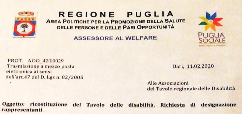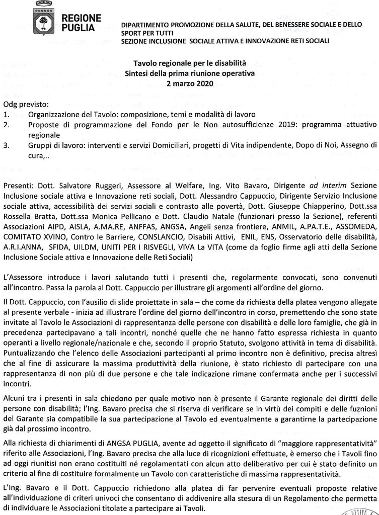 Resoconto del Tavolo per la disabilità della Regione Puglia del 2 marzo 2020 di controlebarriere8 Marzo 2020Lascia un commentoResoconto del Tavolo per la disabilità della Regione Puglia del 2 marzo 2020Assegno di Cura, Attività, Vita indipendente