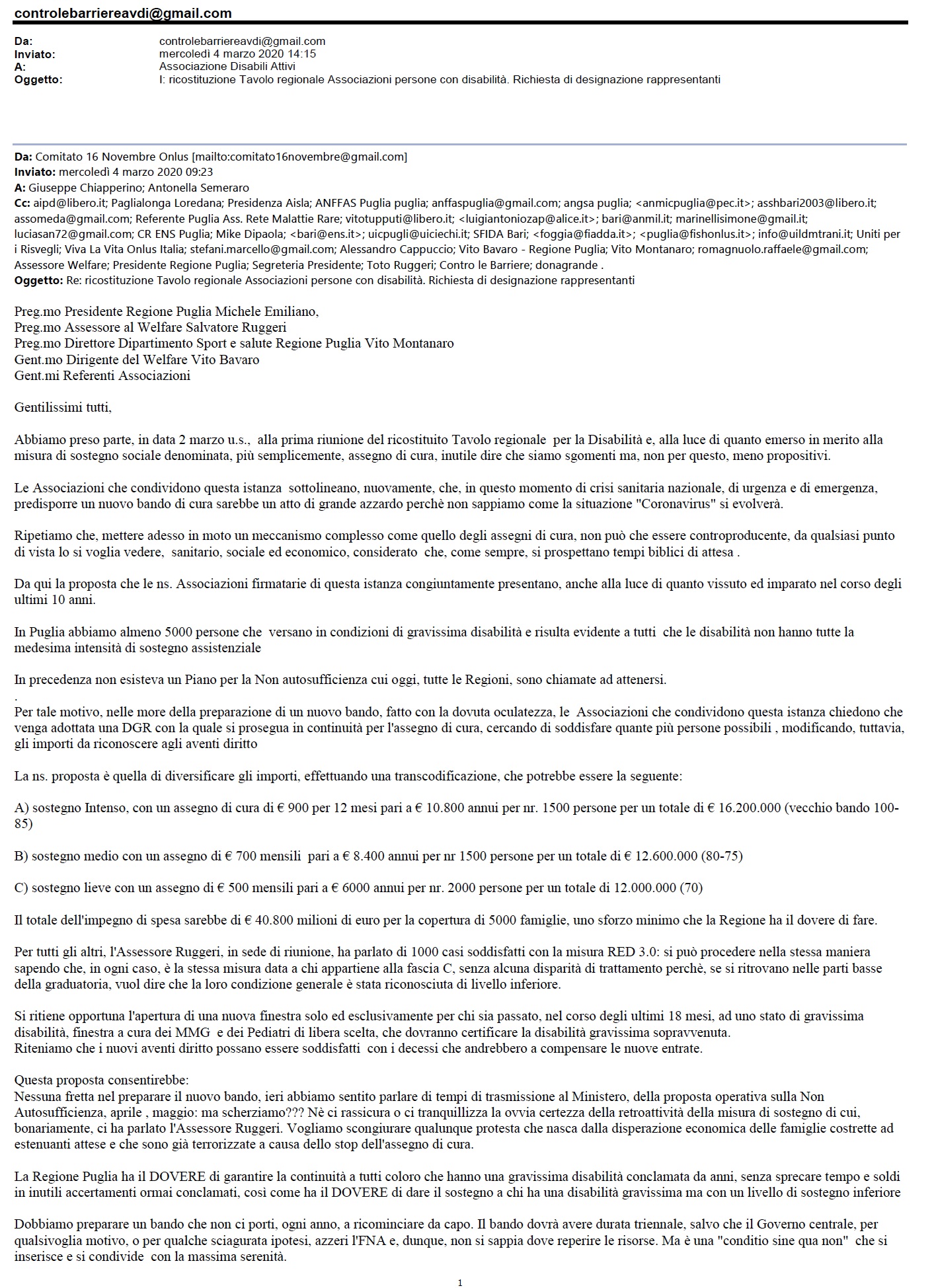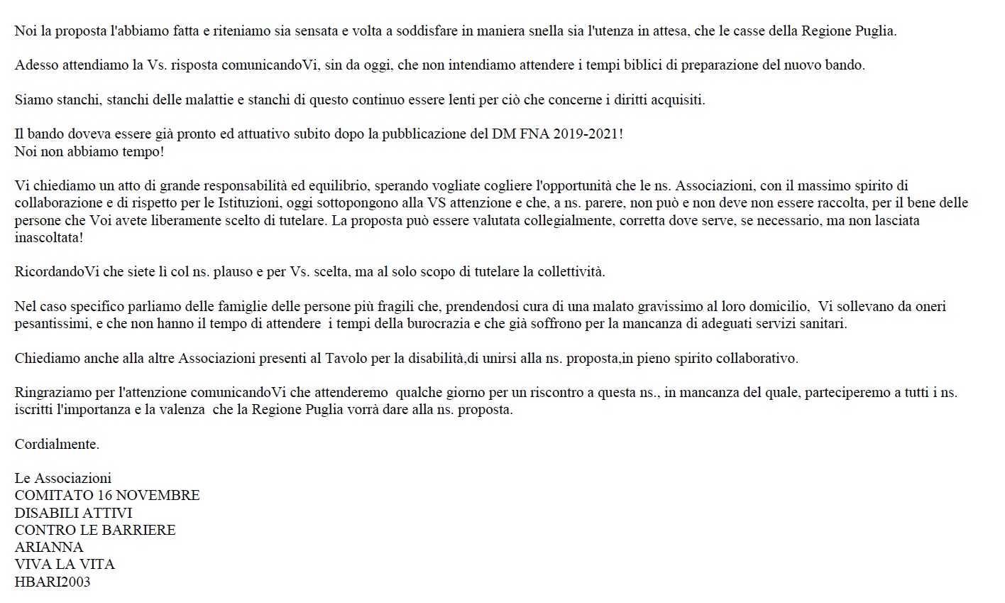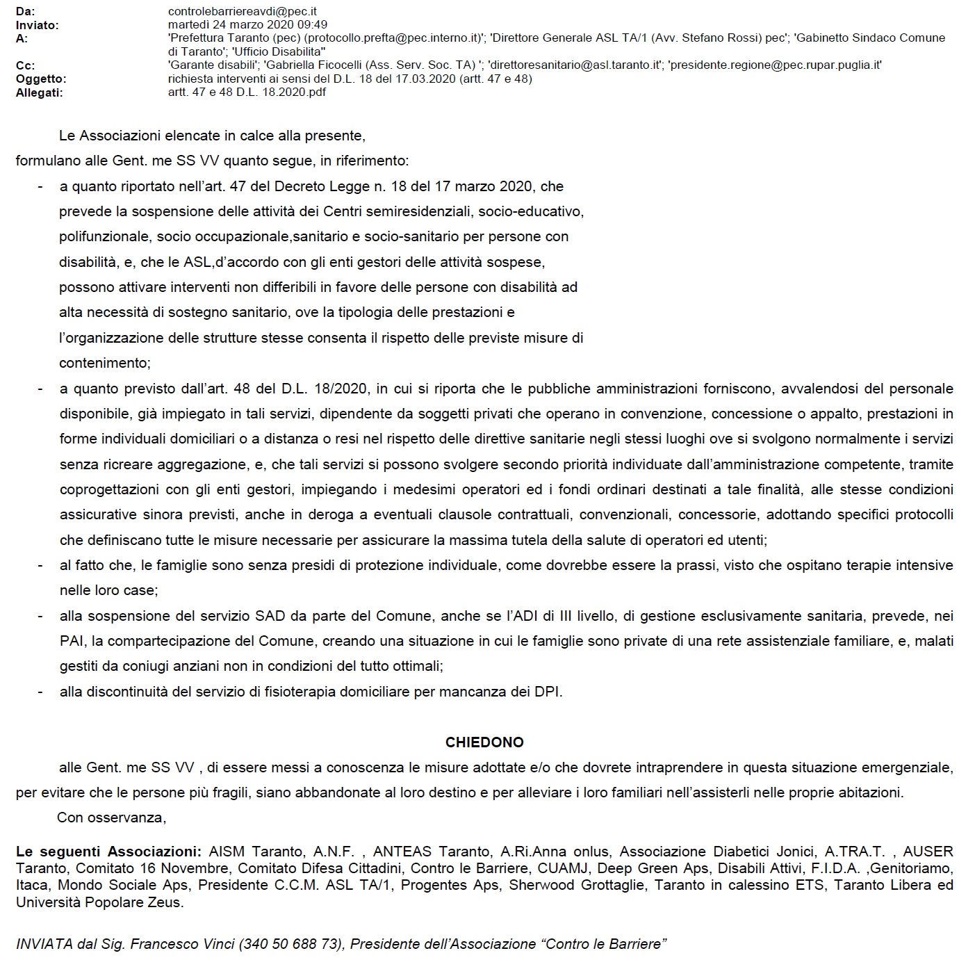 Le Associazioni di Taranto e della Regione Puglia attendono risposte di controlebarriere30 Marzo 202030 Marzo 2020Lascia un commentoLe Associazioni di Taranto e della Regione Puglia attendono risposteAltro QUESTA COMUNICAZIONE E’ STATA INVIATA 26 GIORNI, E, FINO AD ORA, NON C’E’ STATA RISPOSTA. Fino ad ora non hanno risposto nessuno dei destinatari Nella speranza che nel prossimo decreto si tenga conto di questa richiesta