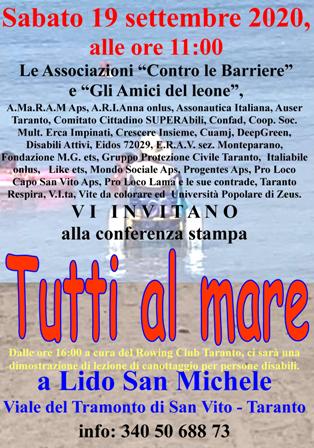 presso lo stabilimento balneare “Lido San Michele” a Taranto, le Associazioni “Contro le Barriere” e “Gli amici del leone”, hanno convocato una conferenza stampa, durante la quale, sarà presentato un progetto da attuare nei comuni costieri della Regione Puglia, per la stagione estiva del 2021 che, per la sua realizzazione, sarà presentato, quando si insedierà il nuovo Consiglio della Regione Puglia, dopo le elezioni del 20 e 21 settembre.