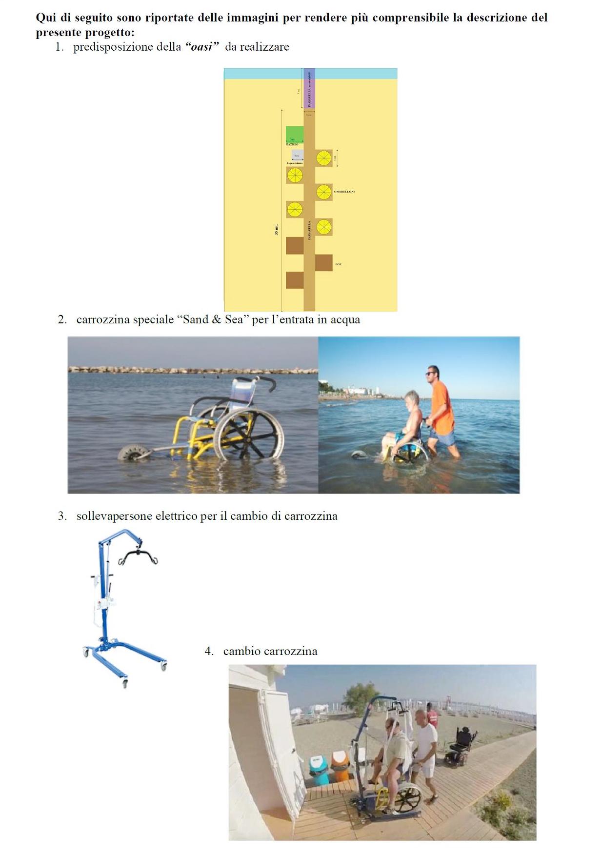 • struttura chiusa alla vista, tipo gazebo di mt. 4 x 4, alloggiata su una pedana di uguale misura, dotato di un sollevapersone elettrico che, in perfetta sicurezza, renderà possibile il trasferimento dalla carrozzina abituale ad una di quelle speciali, nonché dotato di impianto idrico per poter sciacquare le carrozzine speciali con acqua dolce, e, nello stesso tempo permettere ai fruitori di potersi fare la doccia;