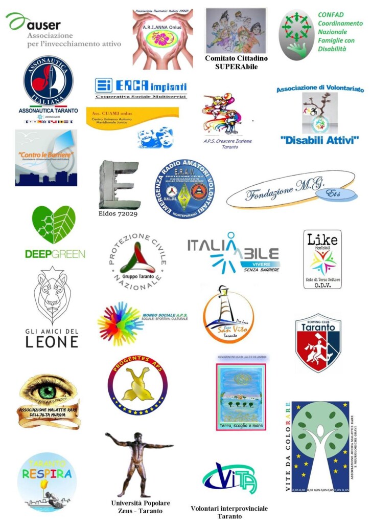 Fino ad ora, al presente progetto hanno aderito le seguenti ventisei Associazioni, di cui si auspica in altre adesioni che potranno giungere in questi giorni: A.Ma.R.A.M Aps, A.R.I.Anna onlus,  Assonautica ItalianaAuser Taranto, Comitato Cittadino  SUPERAbili, Confad, Cooperativa Sociale Multiservizi Erca Impianti, Crescere Insieme, Cuamj, DeepGreen, Disabili Attivi, Eidos 72029, E.R.A.V. sez. Monteparano, Fondazione M.G. ets, Gruppo Protezione Civile Taranto, Italiabile onlus, Like APs, Mondo Sociale Aps, Progentes Aps, Pro Loco Capo San Vito Aps, Pro Loco Lama e le sue contrade, Rowing Club Taranto, Taranto Respira, V.I.ta, Vite da colorare ed Università Popolare di Zeus.