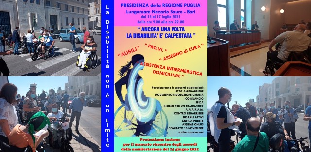 A partire dalle ore 9:00 di martedì 13 luglio 2021, 22 Associazioni pugliesi, ritornano e a protestare nei pressi la Presidenza della Regione Puglia sul Lungomare N. Sauro a Bari, per ottenere quanto richiesto il 15 giugno.