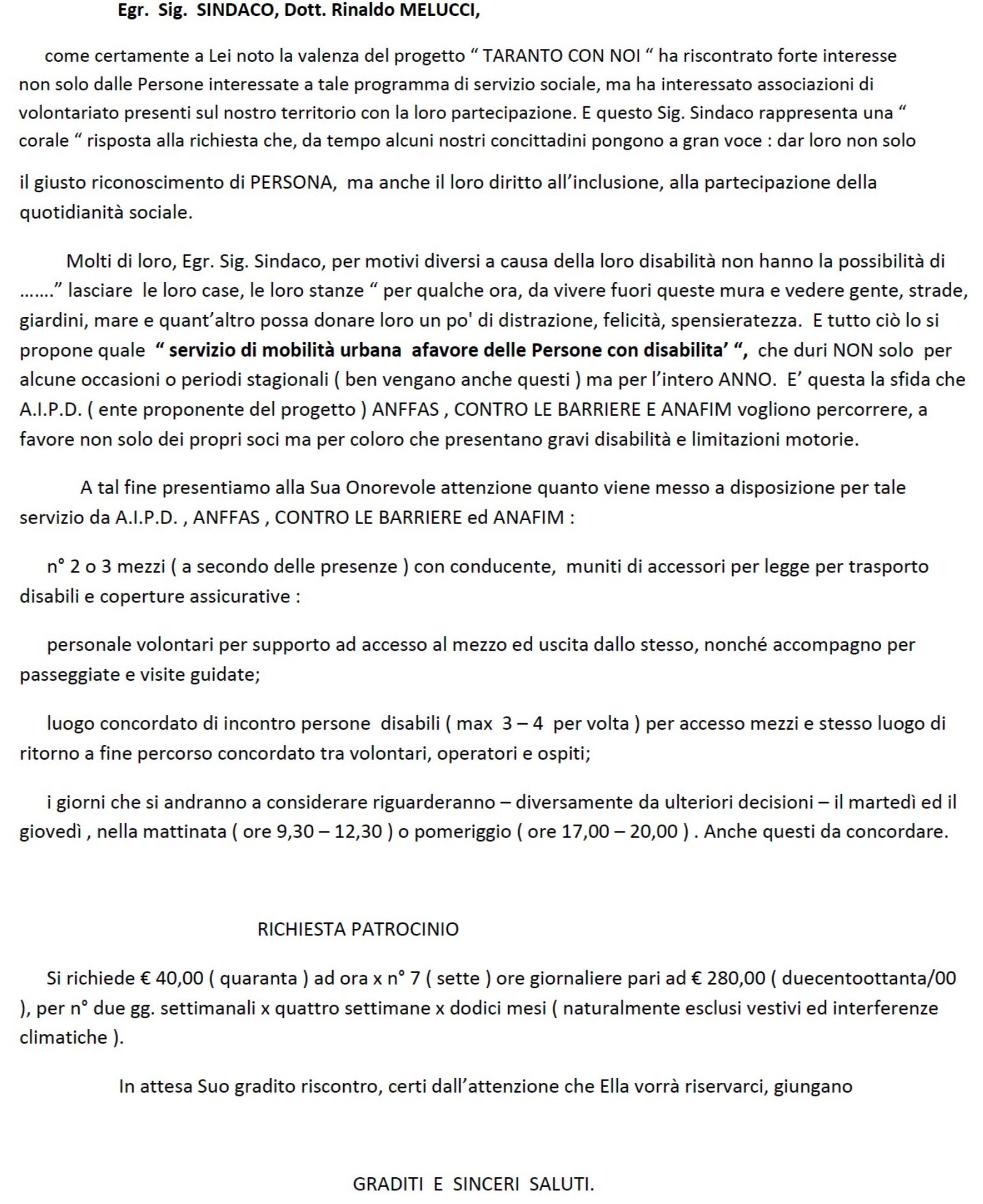 adeguandomi al Suo distaccamento sociale derivante dall’incarico assessorile che Le consiglia di darmi del Lei, mi spiace smentirLa in quanto mai il sottoscritto e le associazioni aderenti al progetto “ TARANTO CON NOI “ hanno posto in dubbio l’indifferenza e la impossibilità dell’Assessorato da Lei guidato nel NON ritenere adeguato alle problematiche della Disabilità il progetto inviato. Ed avendo chiesto il Patrocinio si è a conoscenza dei tempi burocratici ed amministrativi per la ricerca dello stesso, certi della volontà di codesta Amministrazione nel rintracciarli.