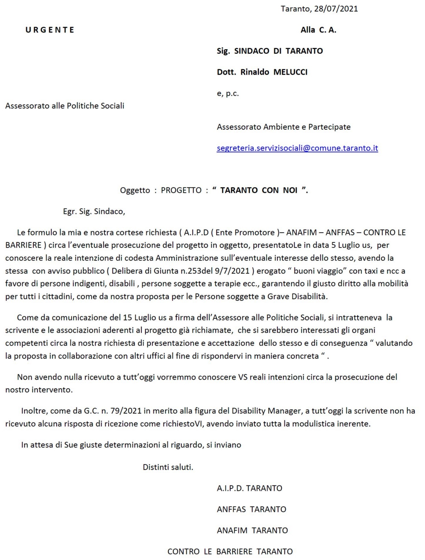 Il 6 luglio 2021, le Associazioni AIPD, ANAFIM, ANFFAS e Contro le Barriere, inviano al Sindaco del Comune di Taranto, Dott. Rinaldo Melucci e per conoscenza all’Assessore alle Municipalizzate, Dott. Paolo Castronovi e l’Assessora alle Politiche Sociali, Sig. ra Gabriella Ficocelli, una richiesta di patrocino per l’attuazione del progetto “Taranto con noi”.