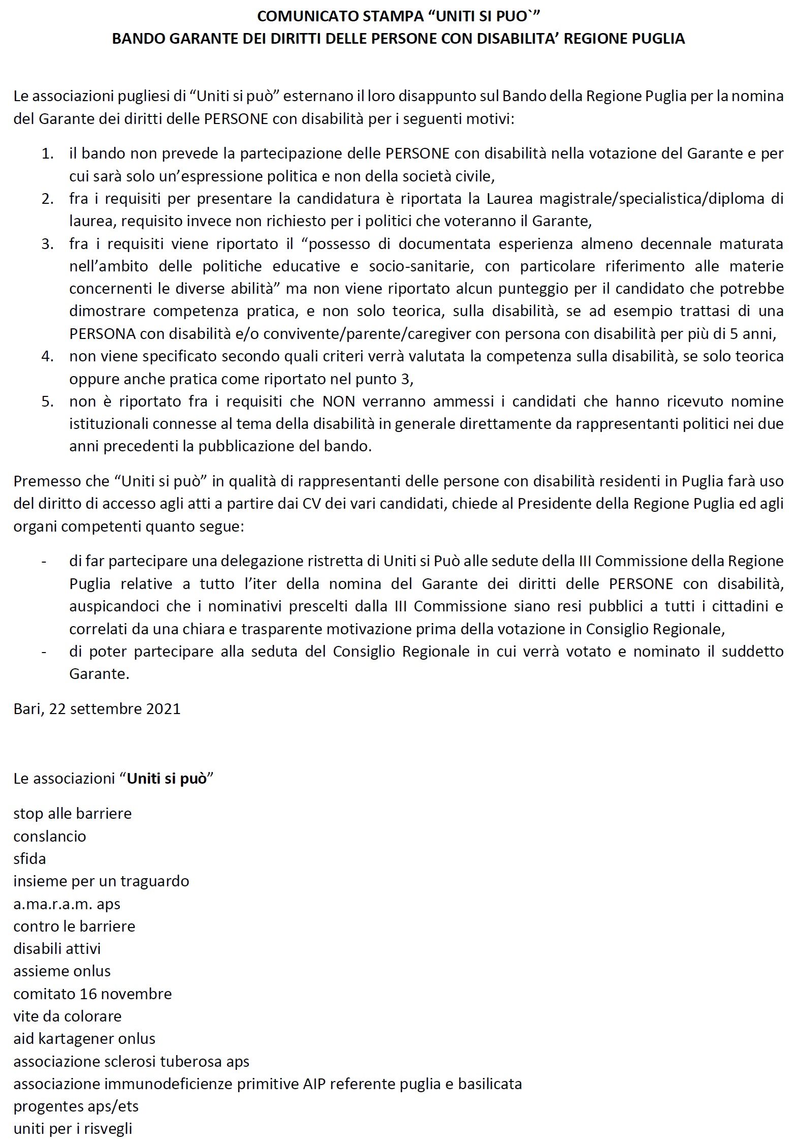 Il 22 settembre le Associazioni di “UNITI SI PUO'” hanno scritto alla Regione Puglia, riguardo al bando per individuare il Garante dei diritti delle persone con disabilità, sono passati due mesi abbondanti e non hanno ricevuto nessuna risposta, mentre il prossimo 3 dicembre sarà celebrata la 40esima giornata internazionale delle persone con disabilità. Pertanto, hanno deciso di inviare la seguente nota alla Regione.