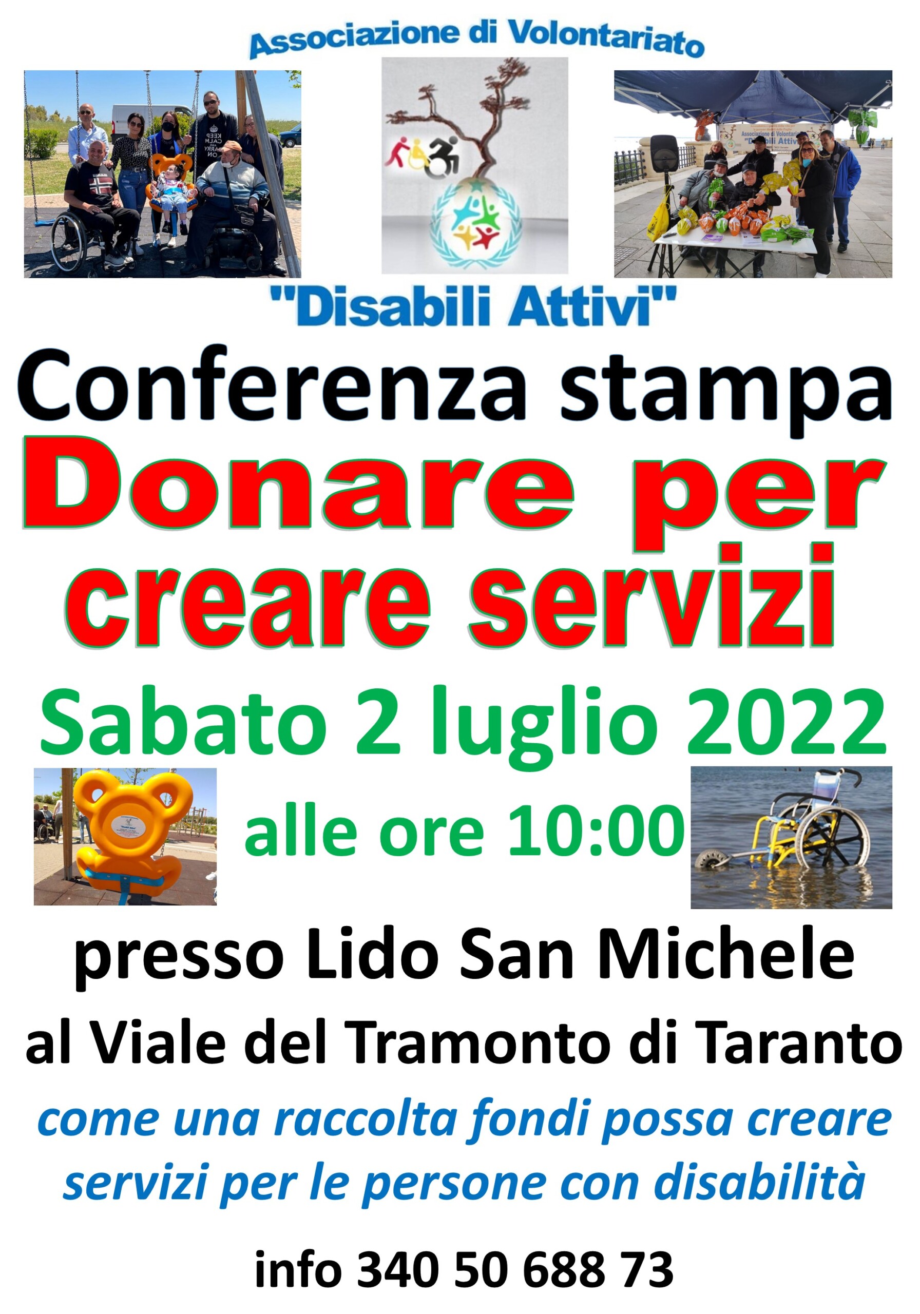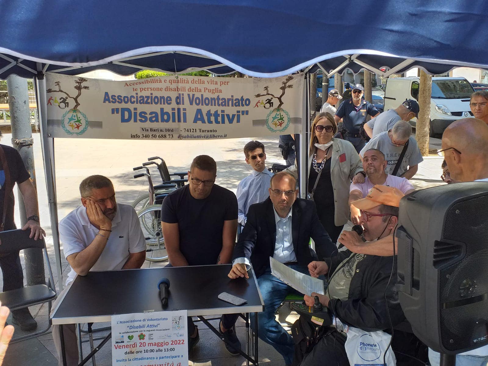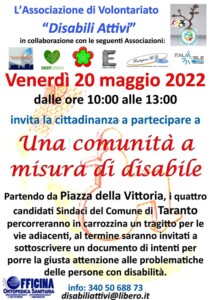 Il 20 maggio, insieme ad altre Associazioni, in concomitanza delle elezioni amministrative del 12 giugno 2022, che si sono svolte nel Comune di Taranto, hanno svolto l’evento denominato “Una comunità a misura di disabile”, durante il quale tre dei quattro candidati Sindaci, Luigi Abbate, Massimo Battista e Walter Musillo, hanno percorso in carrozzina un tragitto nel centro di Taranto, dove si sono fatti notare alcune difficoltà che riscontrano le persone con disabilità, quando escono di casa, come pubblici esercizi inaccessibili, mancanza di scivoli su marciapiedi e/o scivoli troppo pendenti, che li costringono a proseguire il loro percorso sulla strada in mezzo alle auto in movimento.