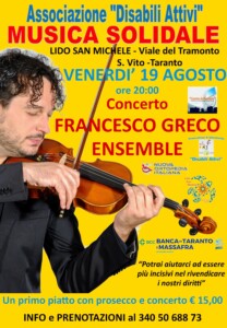 Il 19 agosto, al Viale del Tramonto di Taranto, presso lo stabilimento balneare “Lido San Michele”, hanno svolto l’evento “Musica solidale”, organizzato insieme all’Associazione “Contro le Barriere” e “Disabili Attivi”, durante il quale dopo aver assaporato un bel piatto di cavatelli ai frutti di mare accompagnato da un calice di prosecco, gli ospiti hanno potuto assistere al concerto del Francesco Greco Ensemble. Mentre il 30 dello stesso mese, nello stesso sito, hanno organizzato un altro evento “I mitici anni 80 nel segno della solidarietà“.