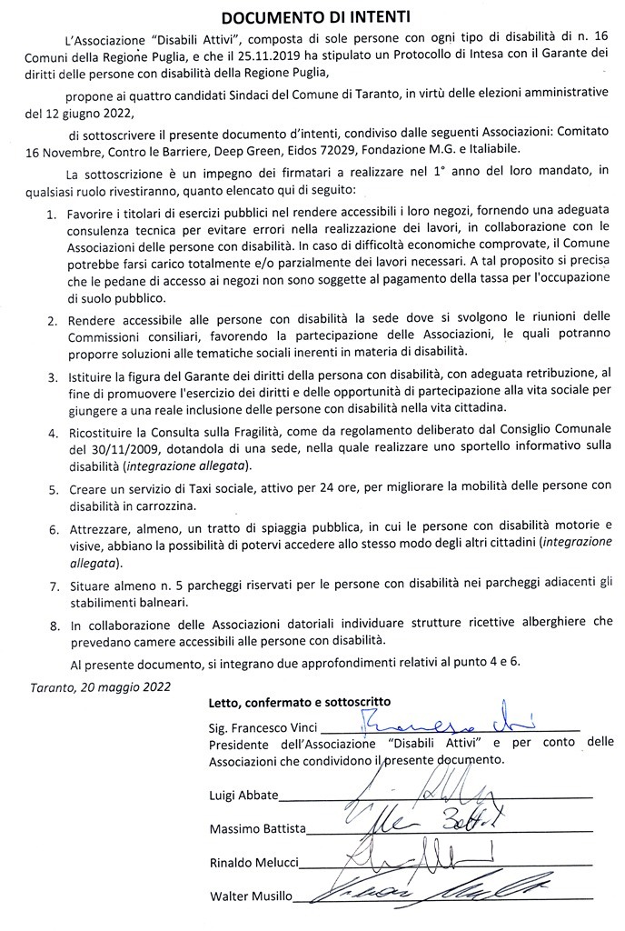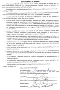 Il documento di intenti prevedeva che nel 1° anno del loro mandato, in qualsiasi ruolo avrebbero rivestito, si sarebbe dovuto approvare i P.E.B.A. (Piani di Eliminazione delle Barriere Architettoniche), favorito la partecipazione popolare ai lavori delle Commissioni Consiliari, istituito la figura del Garante dei diritti della persona con disabilità, l’apertura di uno sportello informativo sulla disabilità e la creazione di un servizio di Taxi sociale, per migliorare la mobilità delle persone con disabilità in carrozzina.