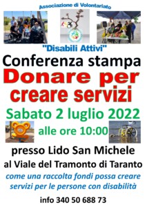 Il 2 luglio, presso lo stabilimento balneare “Lido San Michele” sul Viale del Tramonto a Taranto, svolgono una conferenza stampa, nella quale hanno reso pubblico che, grazie alla raccolta fondi “Un Uovo di Pasqua per regalare un sorriso” sono riusciti a raggiungere l’obiettivo che si erano prefissi di raggiungere, acquistare la carrozzina Sand & Sea, che permette alle persone con disabilità di potersi fare il bagno.